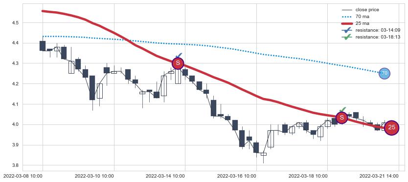 下跌趋势03-08 10:00-03-21 14:00,均线25确认关键阻力2处