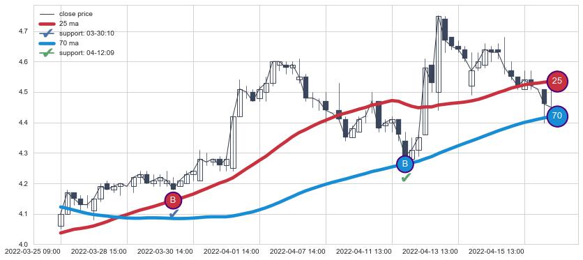 上涨趋势03-25 09:00-04-18 10:00,均线25, 70确认关键支撑2处