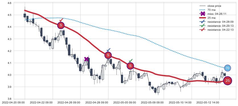 下跌趋势04-20 09:00-05-13 10:00,均线25确认关键阻力3处