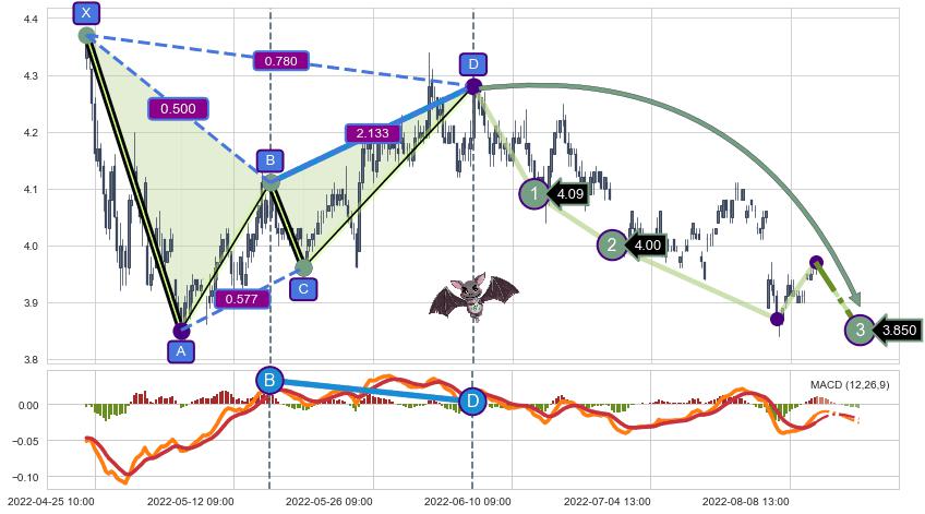 ➣ D点拟合预测价格4.26,距离最后交易收盘价格3.970相差 +7.32%