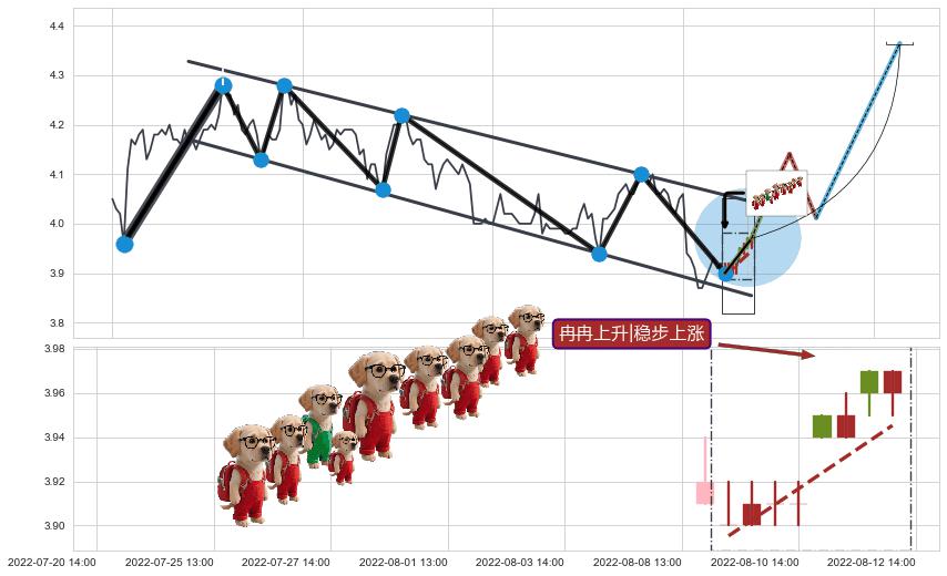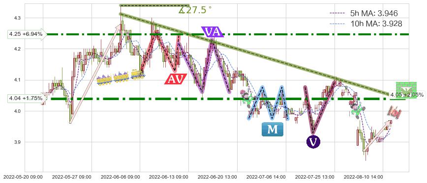 ➢ 【仅预测突破】最后价格:3.970与预测突破价格:4.04→【空间临近】后续最小【整理】第一目标价格→(08-23:11: 4.36 )
