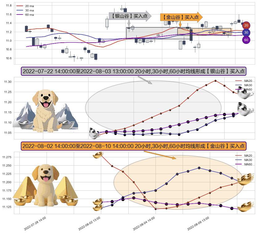 ⚃ 2022-08-03 13:00:00-小时至2022-08-10 14:00:00-小时显现 20小时-30小时-60小时均线 【金山谷】买入点 其再次确认了买入信号,可靠性更强,买入