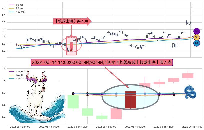 ⚀ 2022-06-14 14:00:00小时显现 60小时-90小时-120小时均线 【蛟龙出海】买入点 看多信号,后市看涨,买入