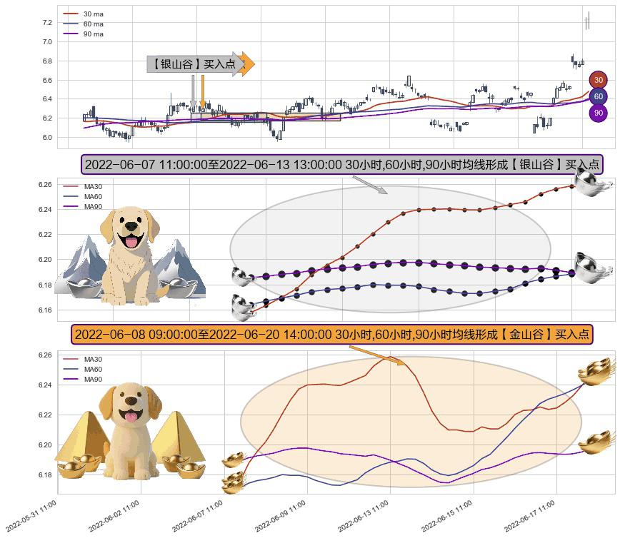 ⚃ 2022-06-08 10:00:00-小时至2022-06-20 14:00:00-小时显现 30小时-60小时-90小时均线 【金山谷】买入点 其再次确认了买入信号,可靠性更强,买入