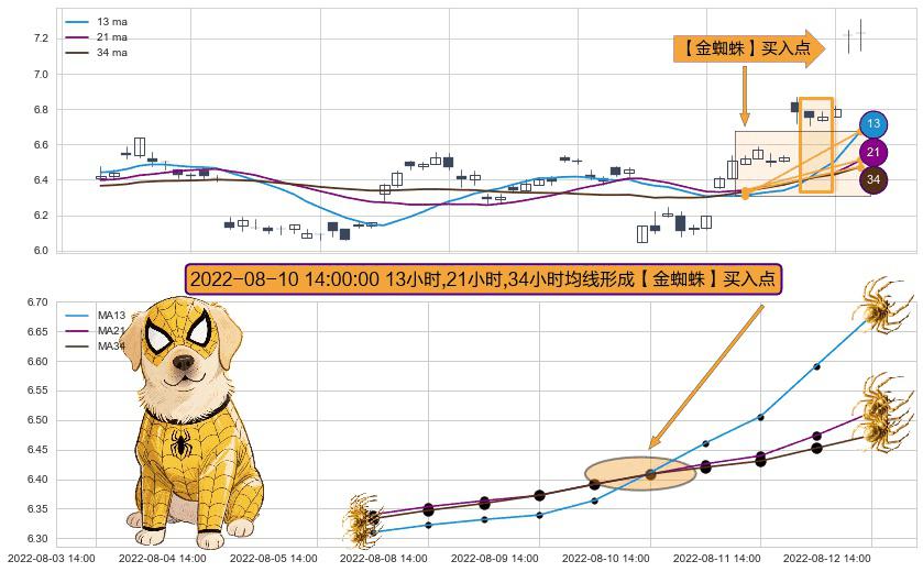 ⚀ 2022-08-10 14:00:00小时显现 13小时-21小时-34小时均线 【金蜘蛛】买入点 看多信号,后市看涨,买入