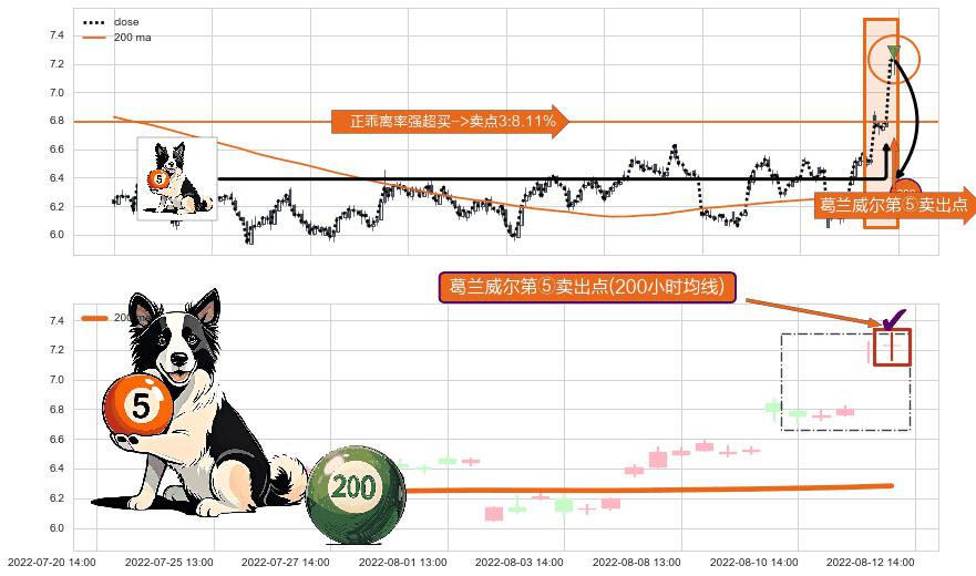 ⚀ 2022-08-12 14:00:00-小时显现 葛兰威尔均线 200小时均线 第⑤卖出点 上升趋势均值回复的短线回落信号,后市看跌,卖出信号