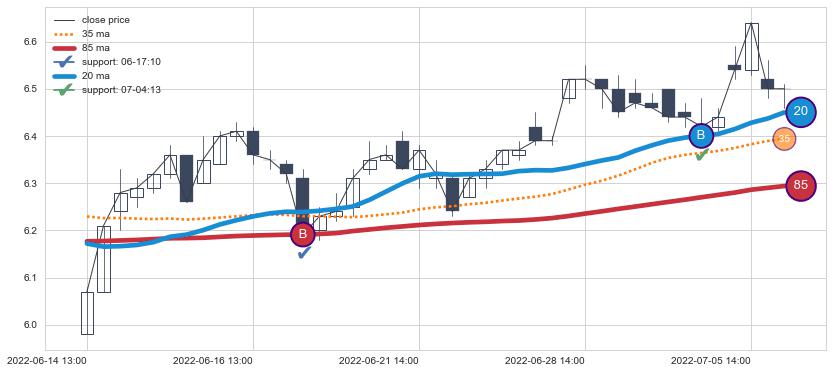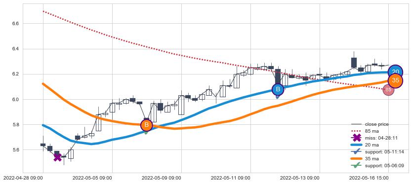 ⚂ 2022-06-14 14:00:00小时突然冒出一根大阳线,一下子顶穿三条均线且收盘价收在各条均线之上