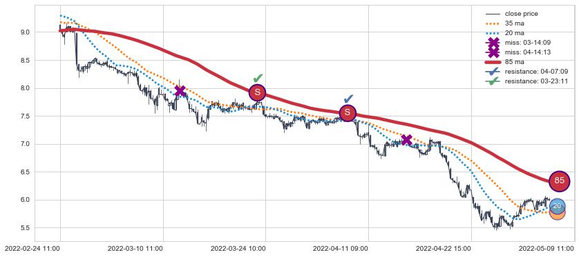 ⚃ 2022-08-12 14:00:00-小时 第⑤卖出点 距离均线【近】距离,均线主动修复向下牵引作用【强】
