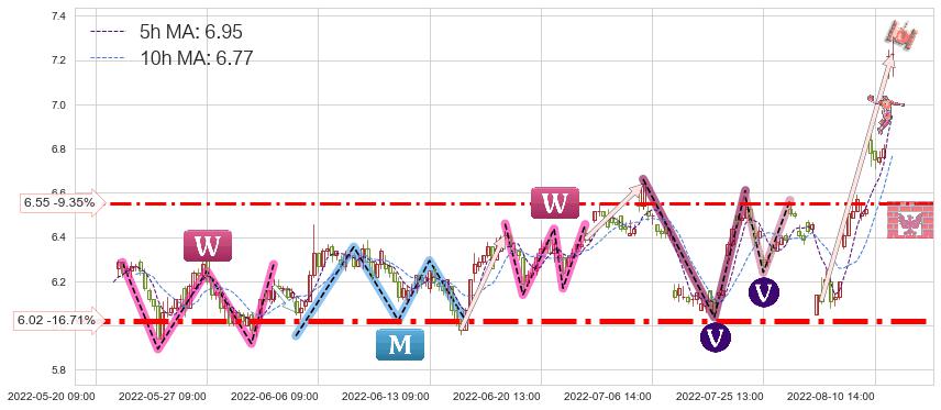 ♞ 5小时均线:6.95,10小时均线:6.77→ 快线>慢线