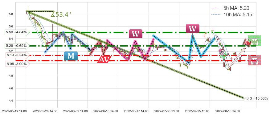 ♘ 阻力价格位5.28,可信任强度82.35%,距离最后交易2022-08-12 14:00形成的收盘价格5.25相差 +0.65%