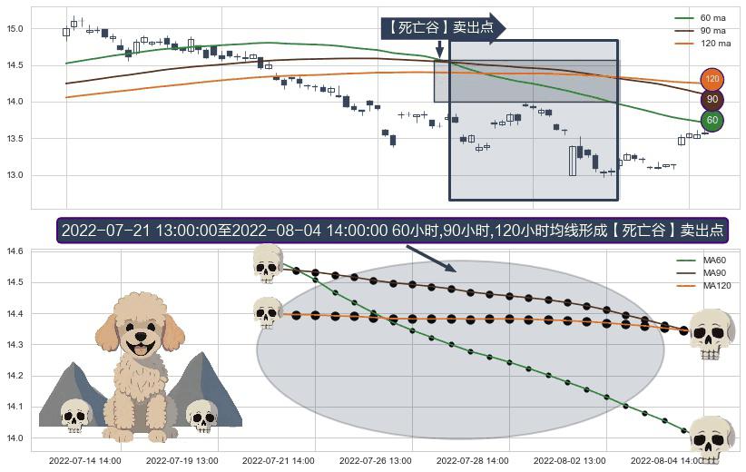 ⚀ 2022-07-21 14:00:00-小时至2022-08-04 14:00:00-小时显现 60小时-90小时-120小时均线 【死亡谷】卖出点 看空信号,后市看跌,卖出