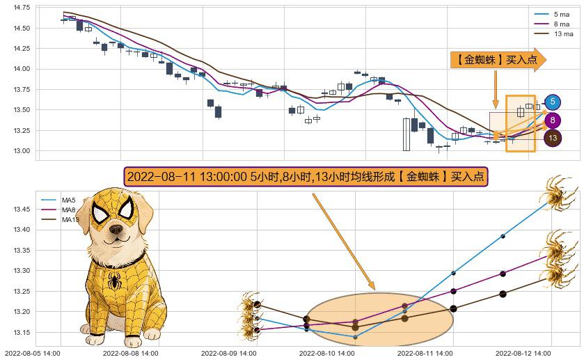 ⚀ 2022-08-11 13:00:00小时显现 5小时-8小时-13小时均线 【金蜘蛛】买入点 看多信号,后市看涨,买入