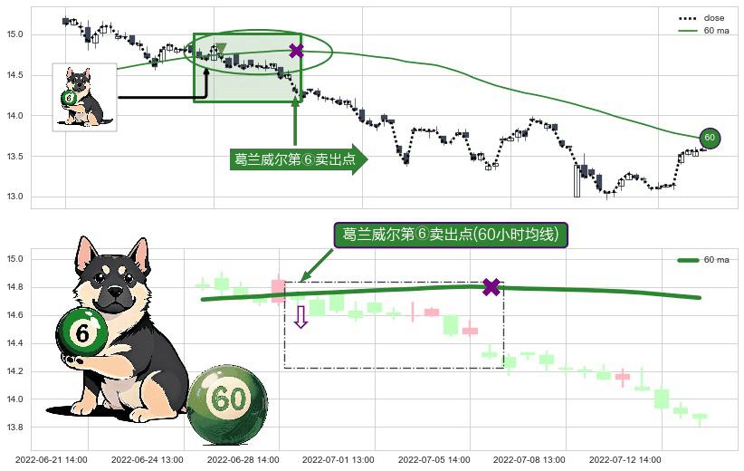 ⚀ 2022-06-29 13:00:00-小时显现 葛兰威尔均线 60小时均线 第⑥卖出点 走势反转见顶信号,后市看跌,卖出信号