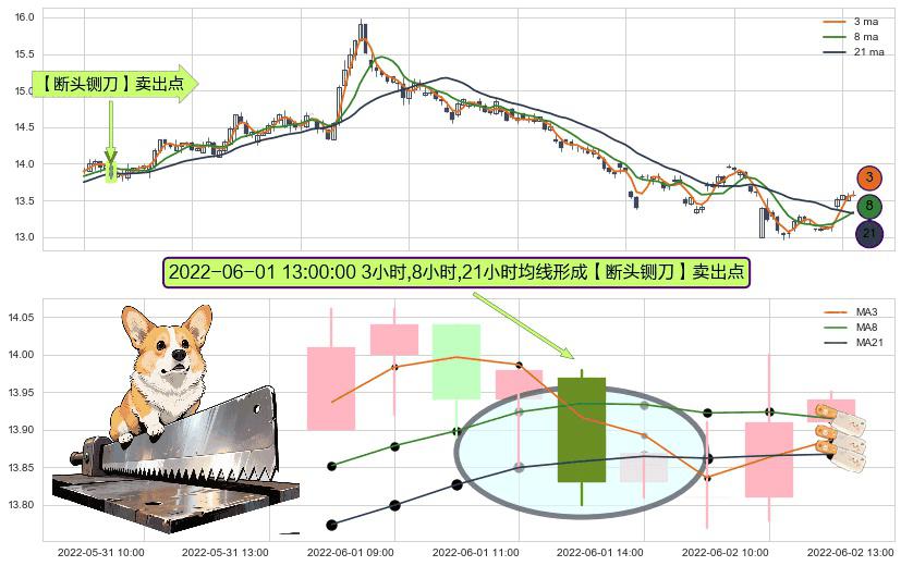 ⚀ 2022-06-01 13:00:00小时显现 3小时-8小时-21小时均线 【断头铡刀】卖出点 看空信号,后市看跌,卖出