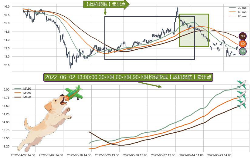 ⚀ 2022-05-16 11:00:00小时-2022-06-28 14:00:00小时显现 30小时-60小时-90小时均线 【战机起航】卖出点 看空信号,后市看跌,卖出
