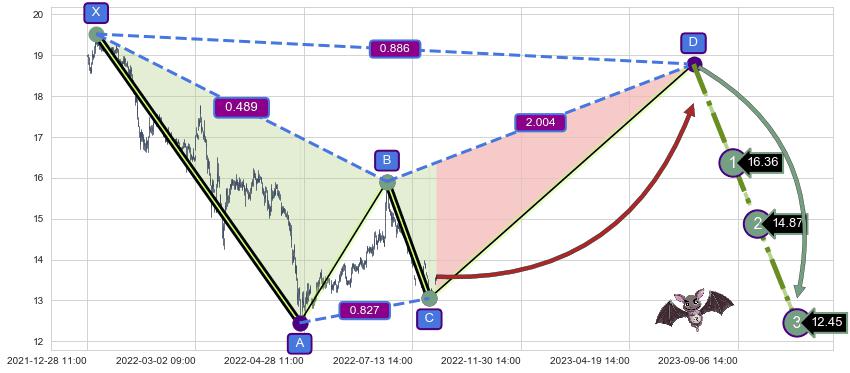 ➣ 未完成【蝙蝠】形态起点X: 12-31:14, 已到达C点: 08-04:13, 预测最终D点: 07-11:14, 共1102交易小时