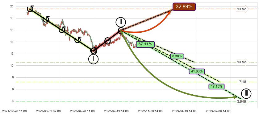 ➣ D点拟合预测价格18.78,距离最后交易收盘价格13.58相差 +38.31%