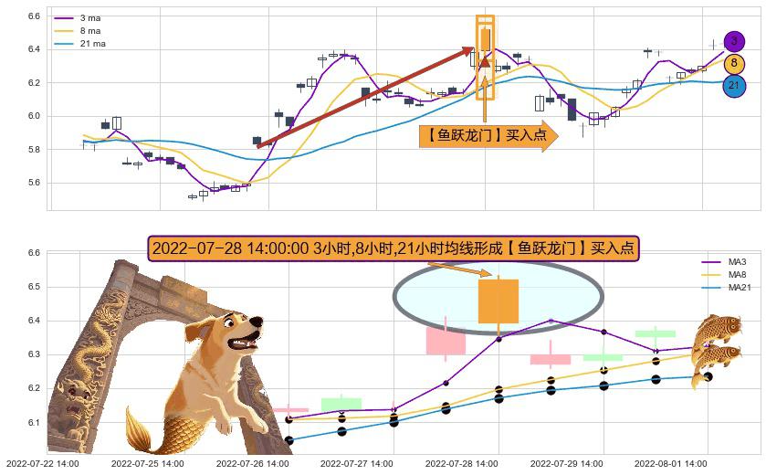 ⚀ 2022-07-28 14:00:00小时显现 3小时-8小时-21小时均线 【鱼跃龙门】买入点 看多信号,后市看涨,买入