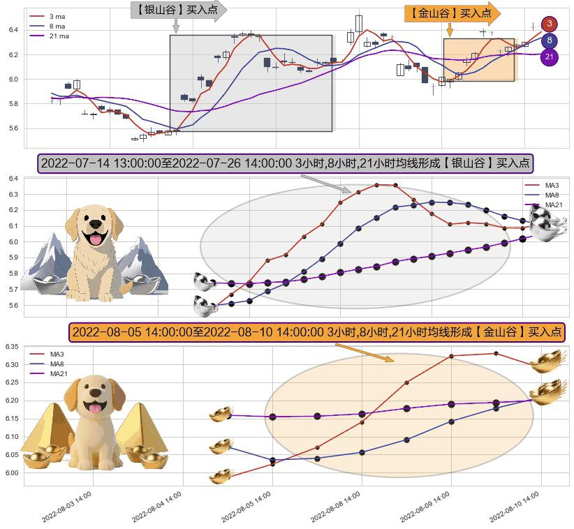 ⚀ 2022-08-08 13:00:00-小时至2022-08-10 14:00:00-小时显现 3小时-8小时-21小时均线 【金山谷】买入点 其再次确认了买入信号,可靠性更强,买入