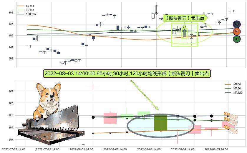 ⚀ 2022-08-03 14:00:00小时显现 60小时-90小时-120小时均线 【断头铡刀】卖出点 看空信号,后市看跌,卖出