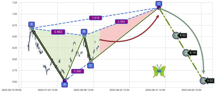 ➣ 未完成【蝴蝶】形态起点X: 06-14:14, 已到达C点: 08-04:13, 预测最终D点: 08-30:12, 共178交易小时