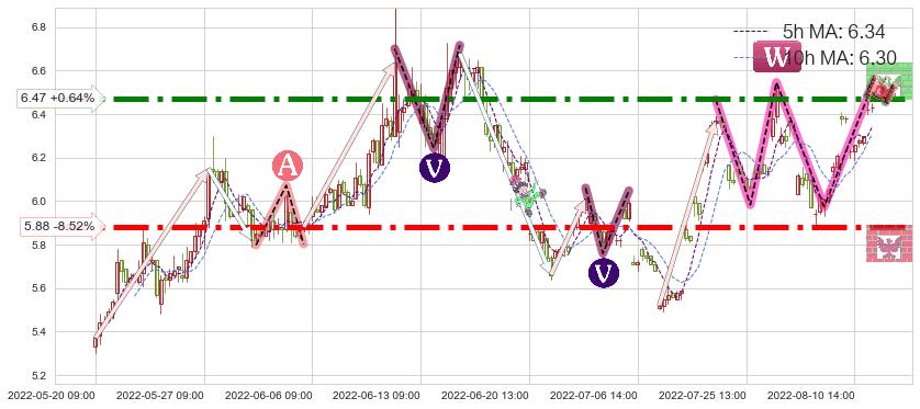 ♘ 阻力价格位6.47,可信任强度85.03%,距离最后交易2022-08-12 14:00形成的收盘价格6.43相差 +0.64%