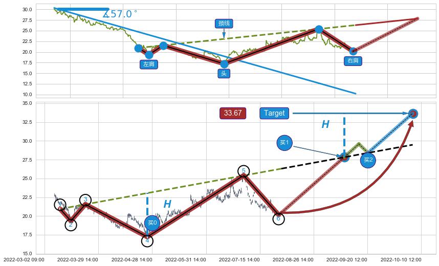 ➣ 最小反转涨幅→𝐇: 5.83 (头部与颈线垂直距离)