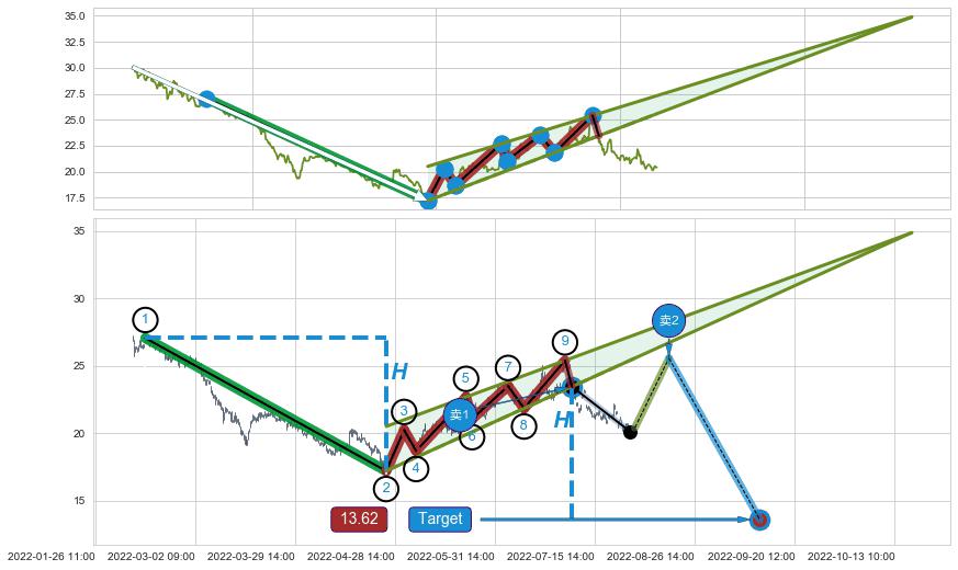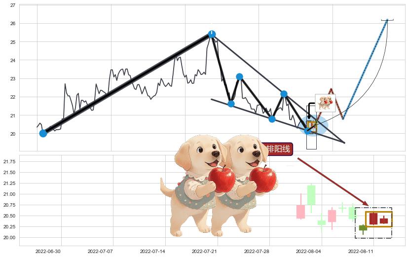 ➣ D点拟合预测价格27.94,距离最后交易收盘价格20.43相差 +36.76%
