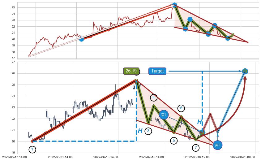 ➢ 最小中继整理涨幅→𝐇: 5.40 (𝐇楔型旗杆的长度:楔型起点→顶点)