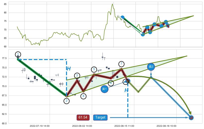 ➢ 最小中继整理跌幅→𝐇: 9.85 (𝐇楔型旗杆的长度:楔型起点→顶点)