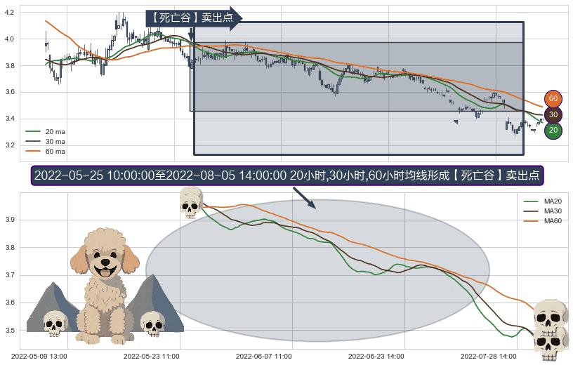 形态多维评估: ⚀ 2022-05-25 11:00:00-小时至2022-08-05 14:00:00-小时显现 20小时-30小时-60小时均线 【死亡谷】卖出点 看空信号,后市看跌,卖出