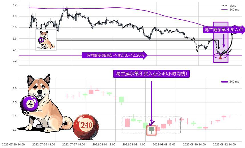 形态多维评估: ⚀ 2022-08-04 13:00:00-小时显现 葛兰威尔均线 240小时均线 第④买入点 下降趋势均值回复的短线反弹信号,后市看涨,买进信号