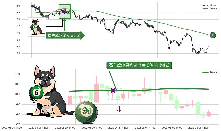 形态多维评估: ⚀ 2022-05-31 09:00:00-小时显现 葛兰威尔均线 90小时均线 第⑥卖出点 走势反转见顶信号,后市看跌,卖出信号