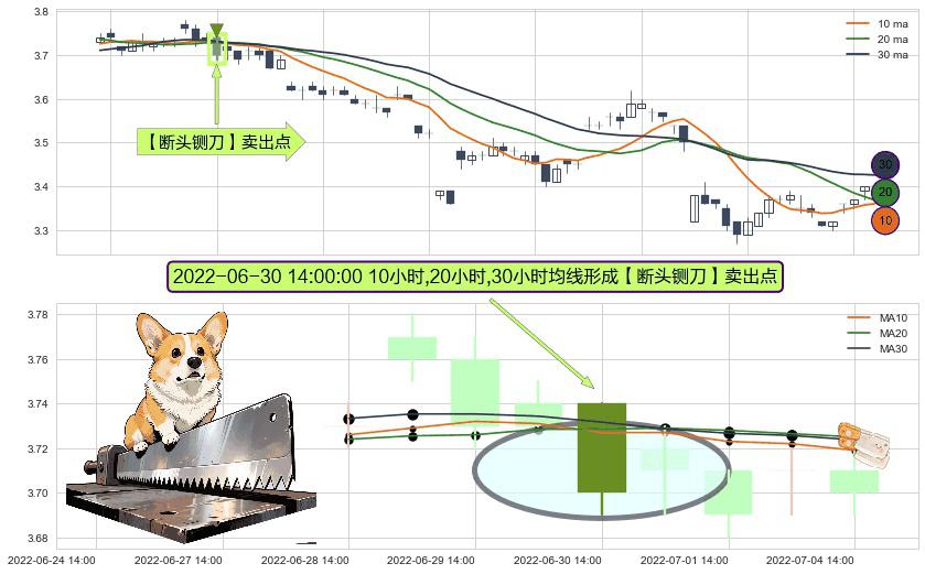 形态多维评估: ⚀ 2022-06-30 14:00:00小时显现 10小时-20小时-30小时均线 【断头铡刀】卖出点 看空信号,后市看跌,卖出