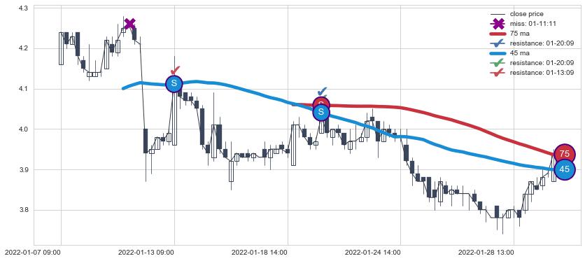 下跌趋势05-20 09:00-08-12 14:00,均线75确认关键阻力4处