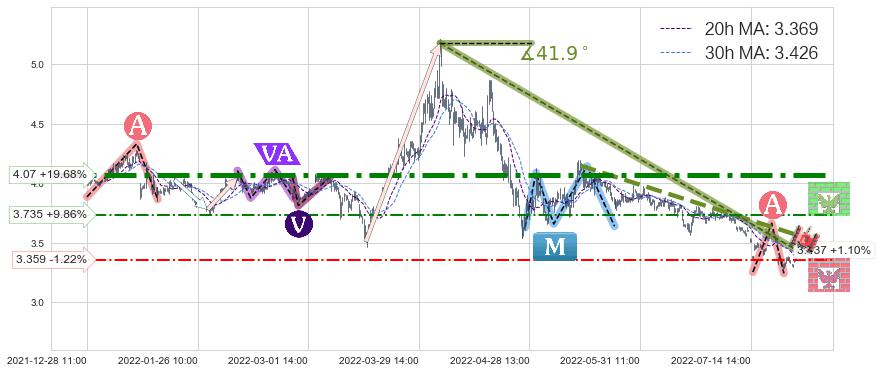 ♘ 阻力价格位3.735,可信任强度46.21%,距离最后交易2022-08-12 14:00形成的收盘价格3.400相差 +9.86%