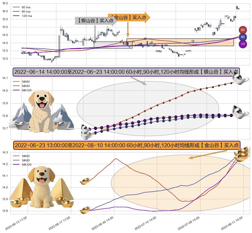 ⚃ 2022-06-23 14:00:00-小时至2022-08-10 14:00:00-小时显现 60小时-90小时-120小时均线 【金山谷】买入点 其再次确认了买入信号,可靠性更强,买入