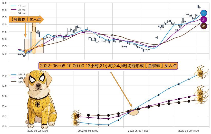 ⚀ 2022-06-08 10:00:00小时显现 13小时-21小时-34小时均线 【金蜘蛛】买入点 看多信号,后市看涨,买入