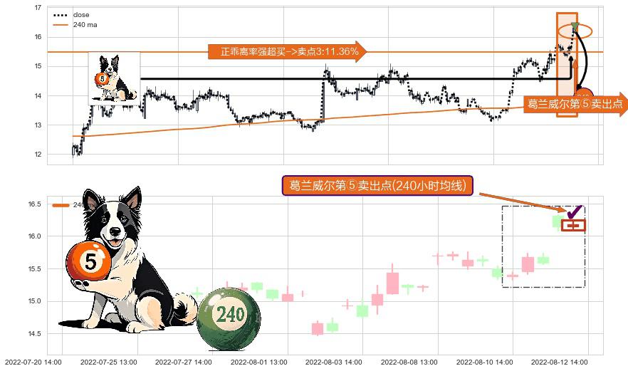 ⚀ 2022-08-12 14:00:00-小时显现 葛兰威尔均线 240小时均线 第⑤卖出点 上升趋势均值回复的短线回落信号,后市看跌,卖出信号