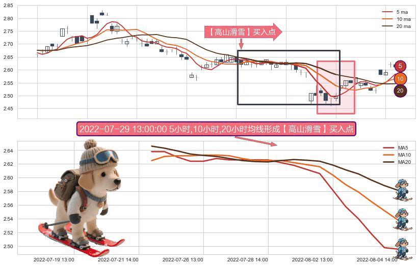 形态多维评估: ⚀ 2022-07-22 13:00:00小时-2022-08-04 14:00:00小时显现 5小时-10小时-20小时均线 【高山滑雪】买入点 看多信号,后市看涨,买入