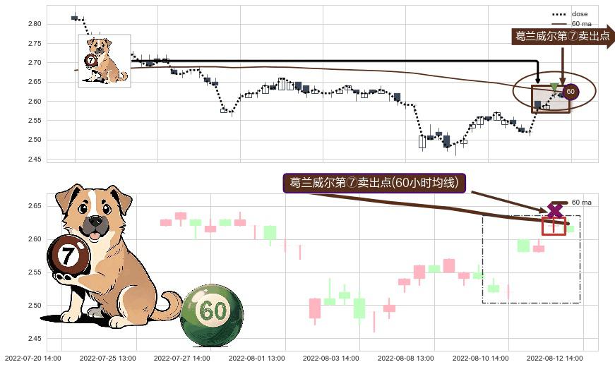 形态多维评估: ⚀ 2022-08-12 13:00:00-小时显现 葛兰威尔均线 60小时均线 第⑦卖出点 下降趋势的中继信号,后市看跌,卖出信号