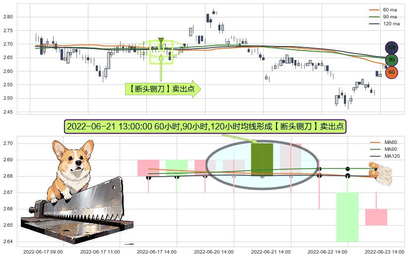 形态多维评估: ⚀ 2022-06-21 13:00:00小时显现 60小时-90小时-120小时均线 【断头铡刀】卖出点 看空信号,后市看跌,卖出