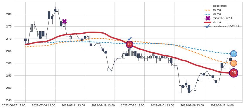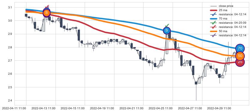 下跌趋势04-11 11:00-04-29 14:00,均线25, 50, 70确认关键阻力2处