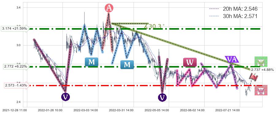 ♘ 在最后的下跌阶段2022-03-15 14:00至2022-08-12 14:00,存在 持续未破位的阻力位 ,阻力价格2.737,可信任强度75.45%,其距离最后价格2.610相差 +4.88%