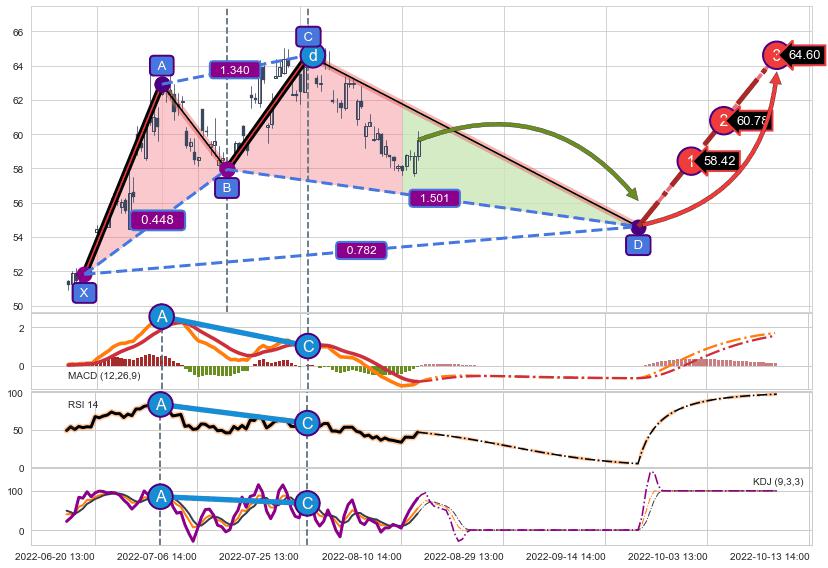 ➣ D点拟合预测价格54.61,距离最后交易收盘价格59.65相差 -8.46%
