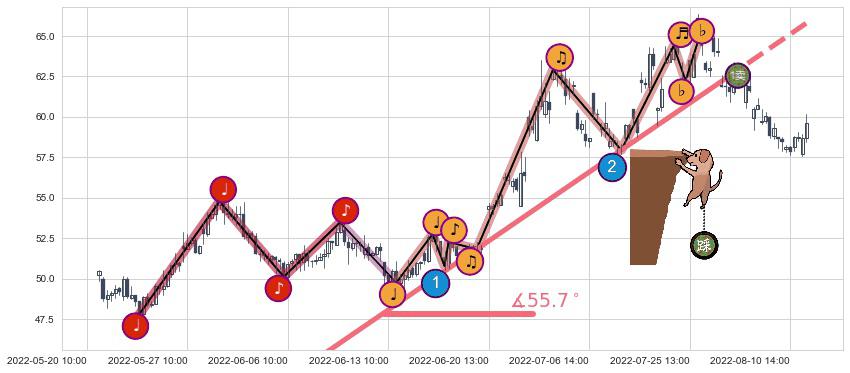 从2022-05-24 14:00至2022-07-29 14:00,共包含147个小时,阶段股价上涨27.54%,阶段股价变动位移路程比: 1 : 5,上涨趋势角度: 55.7
