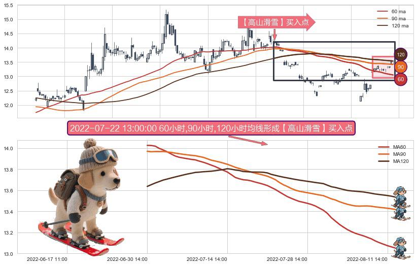⚀ 2022-06-30 14:00:00小时-2022-08-12 14:00:00小时显现 60小时-90小时-120小时均线 【高山滑雪】买入点 看多信号,后市看涨,买入