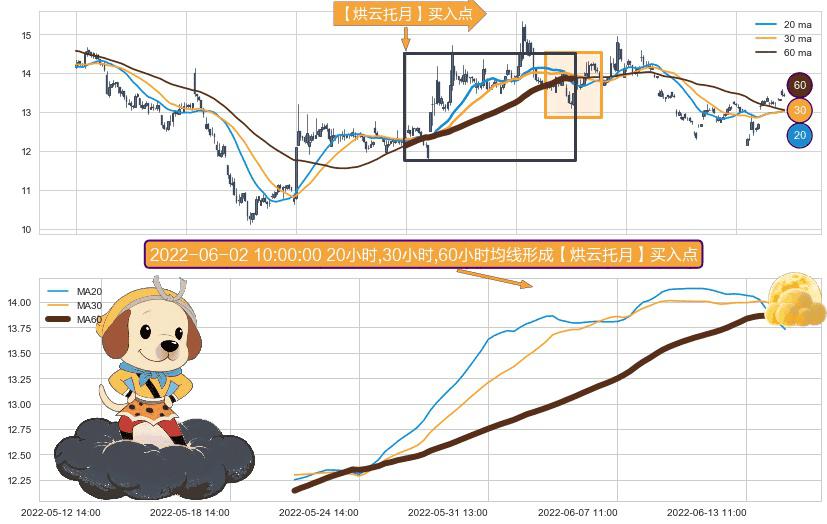 ⚀ 2022-05-20 14:00:00小时-2022-06-14 13:00:00小时显现 20小时-30小时-60小时均线 【烘云托月】买入点 看多信号,后市看涨,买入