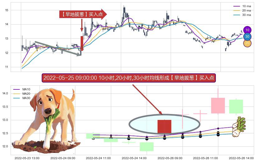 ⚀ 2022-05-25 09:00:00小时显现 10小时-20小时-30小时均线 【旱地拔葱】买入点 看多信号,后市看涨,买入