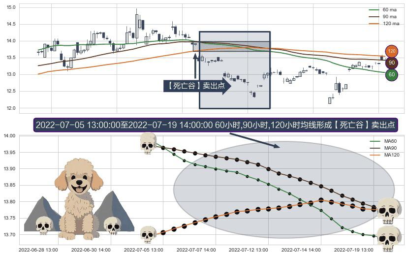 ⚀ 2022-07-05 14:00:00-小时至2022-07-19 14:00:00-小时显现 60小时-90小时-120小时均线 【死亡谷】卖出点 看空信号,后市看跌,卖出